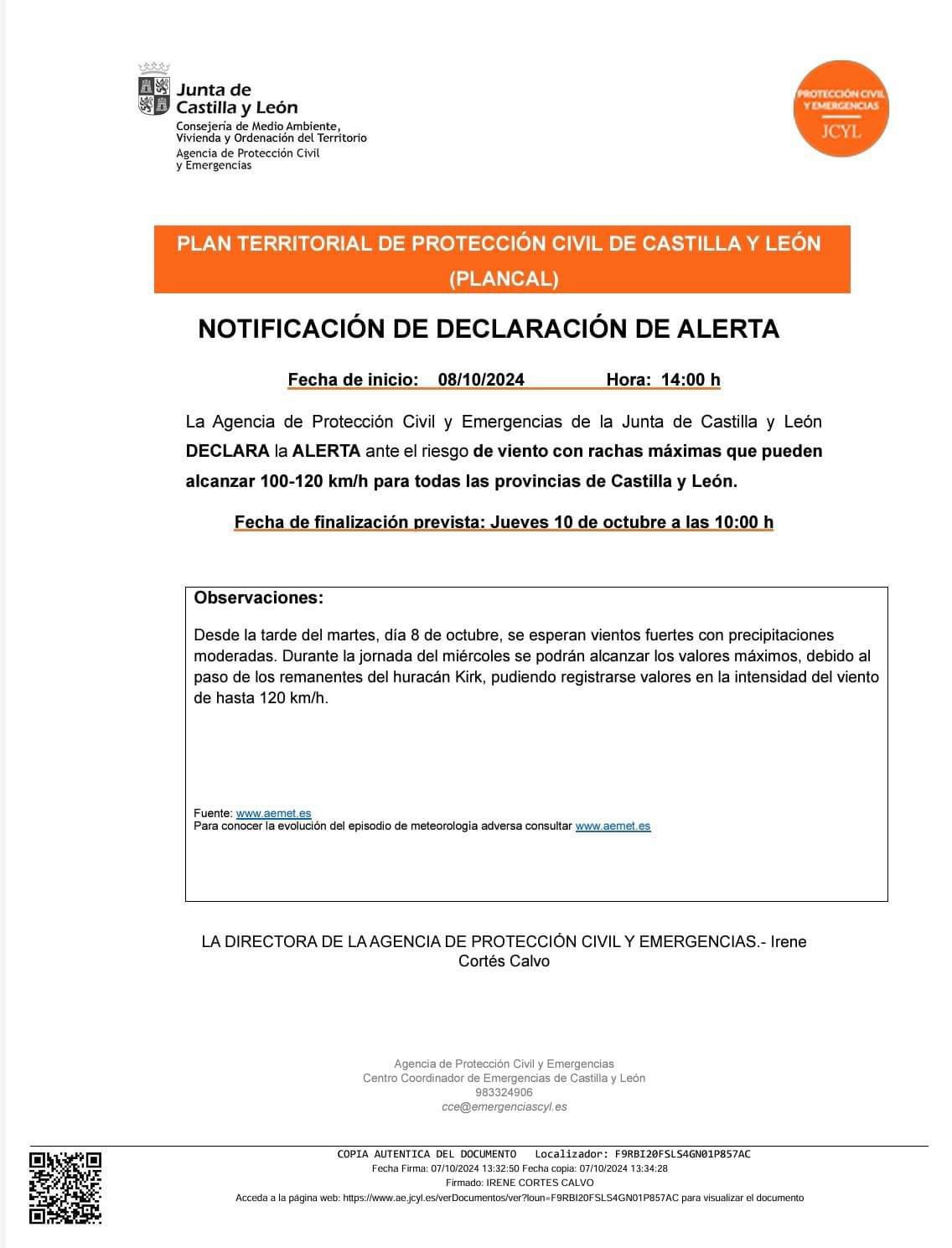 Alerta de riesgo de viento hasta 10/10/24 10:00