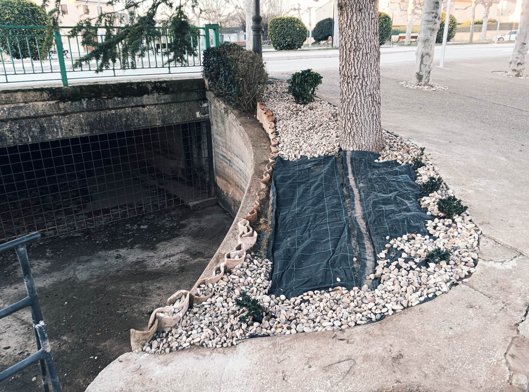 Se está instalando cantos rodados en los jardines a la entrada del bar, lo lleva Elena.
